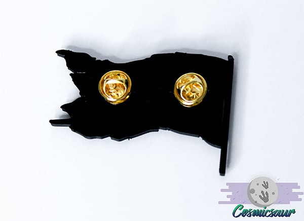 Pin is backed with 2 metal butterfly backed pins. Measures 2.3 inches wide.