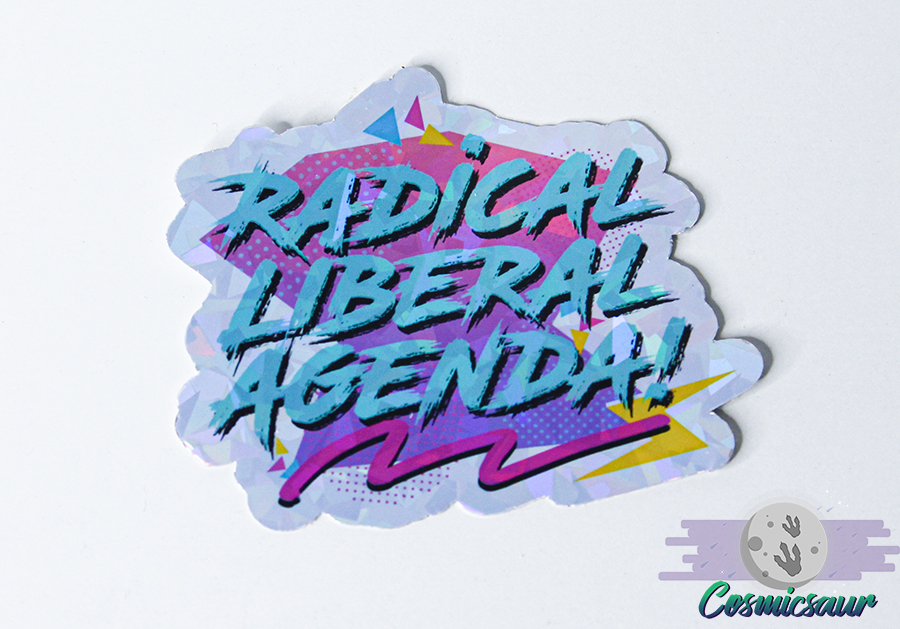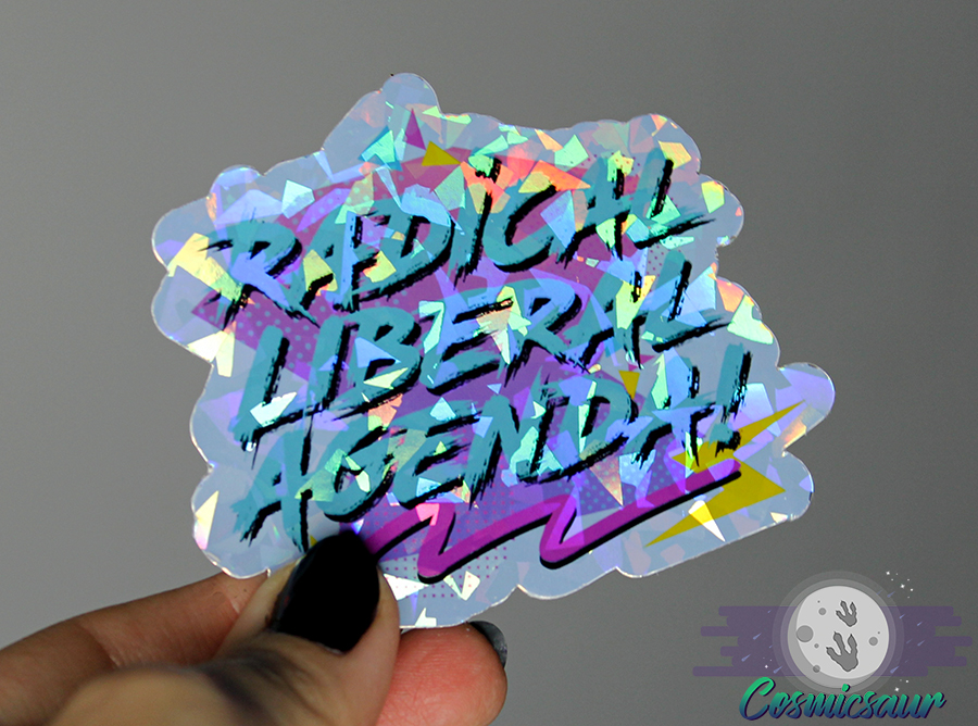 This holographic sticker features my own 90's inspired graphic design and reads "Radical Liberal Agenda!".
