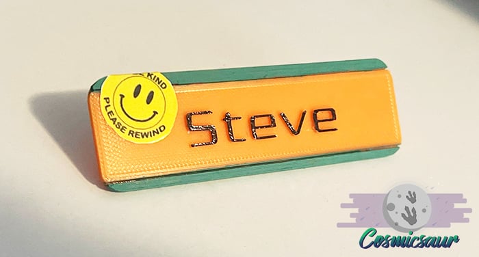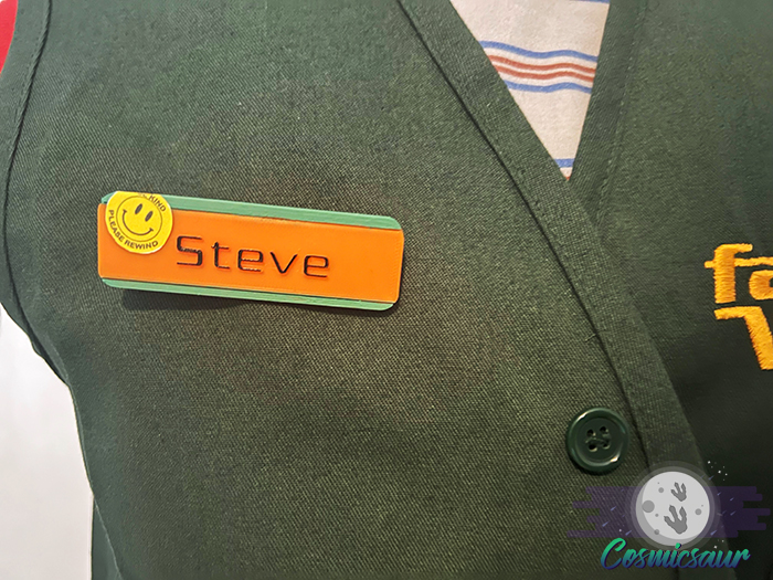 This listing is for a fully painted and finished Steve name tag 3D printed pin, featuring the yellow smiley face "Be Kind, Please Rewind" sticker on the top left corner.