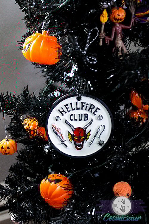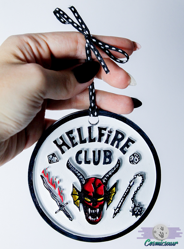 3D rendered, printed and hand painted, this ornament measures 4 inches across and hangs with a black and white ribbon.