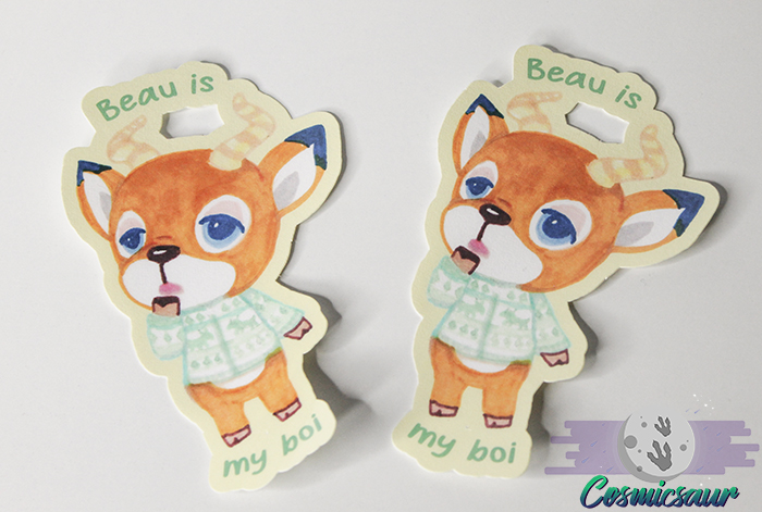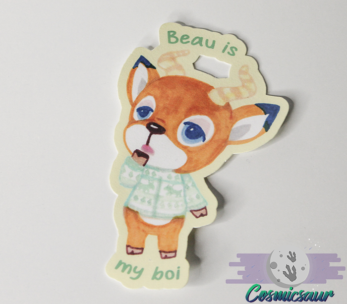 This laminated sticker featuring my hand drawn art of Beau from the Animal Crossing series!