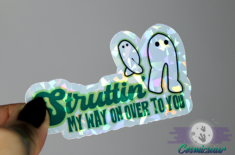 This holographic sticker features my own graphic design of the Fresno Nightcrawler cryptid and reads "Struttin' My Way on Over to You!"