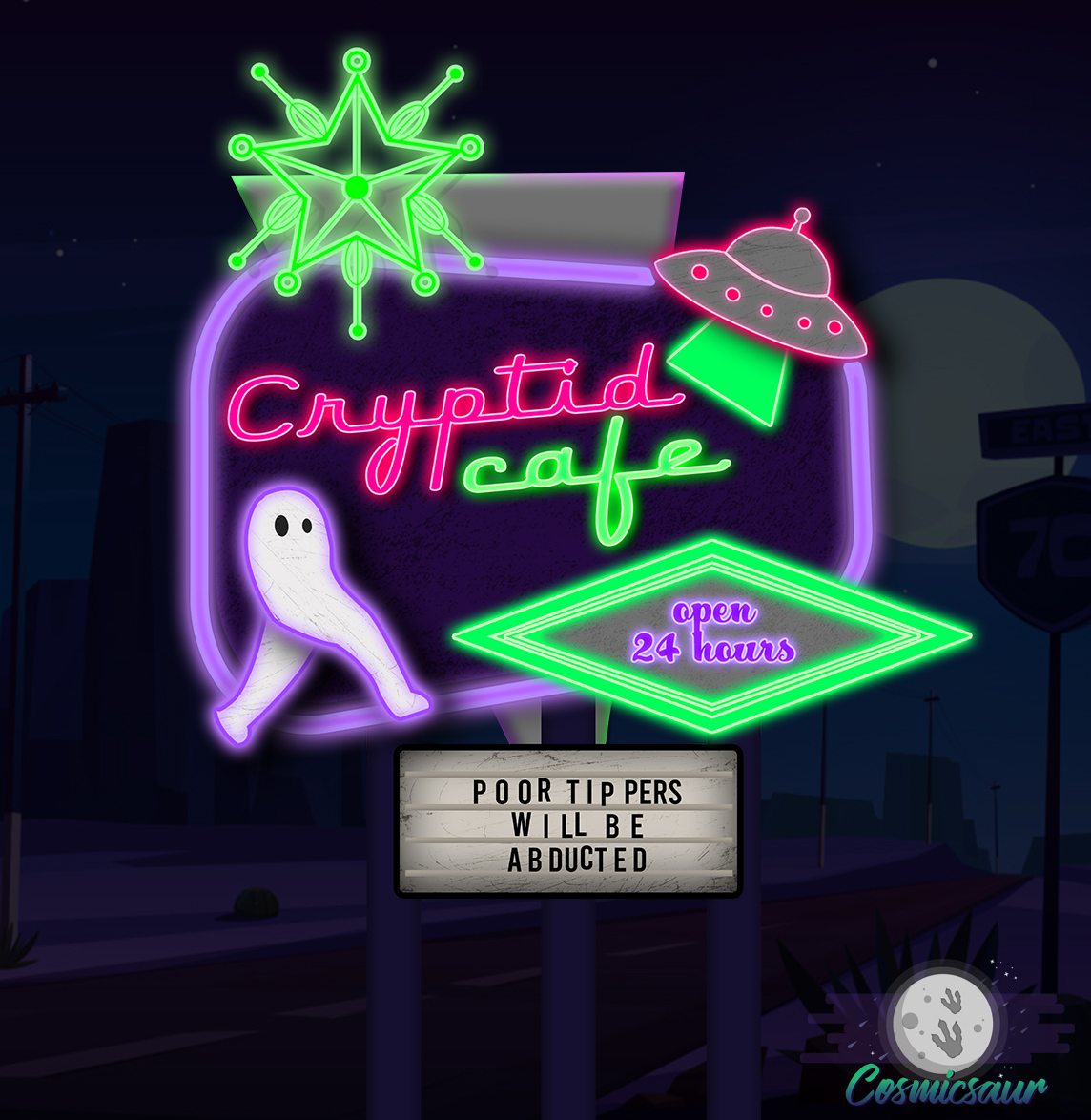 Vinyl sticker featuring my Cryptid Retro Signs: Cryptid Cafe!*