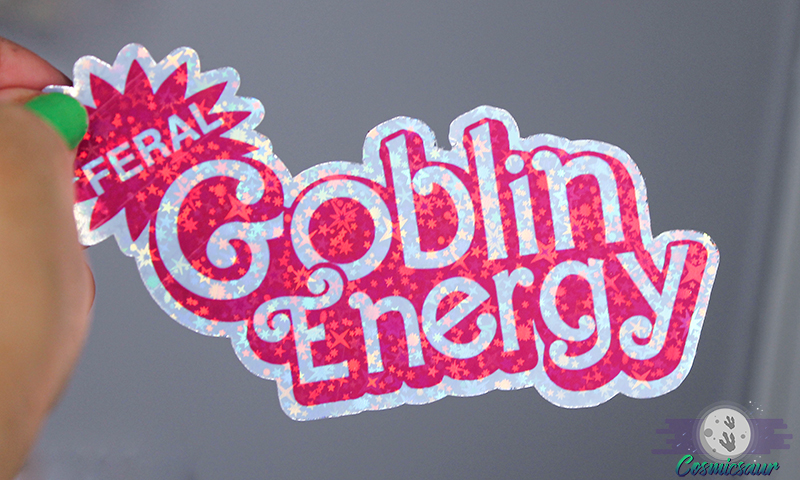 "Feral Goblin Energy" in classic vintage Barbie font, holographic sticker.